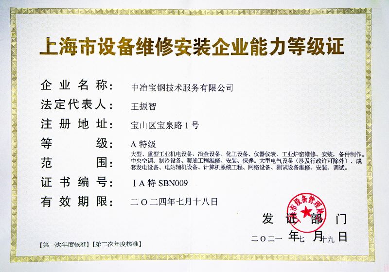 上海市設備維修安裝企業能力等級證(A特級)